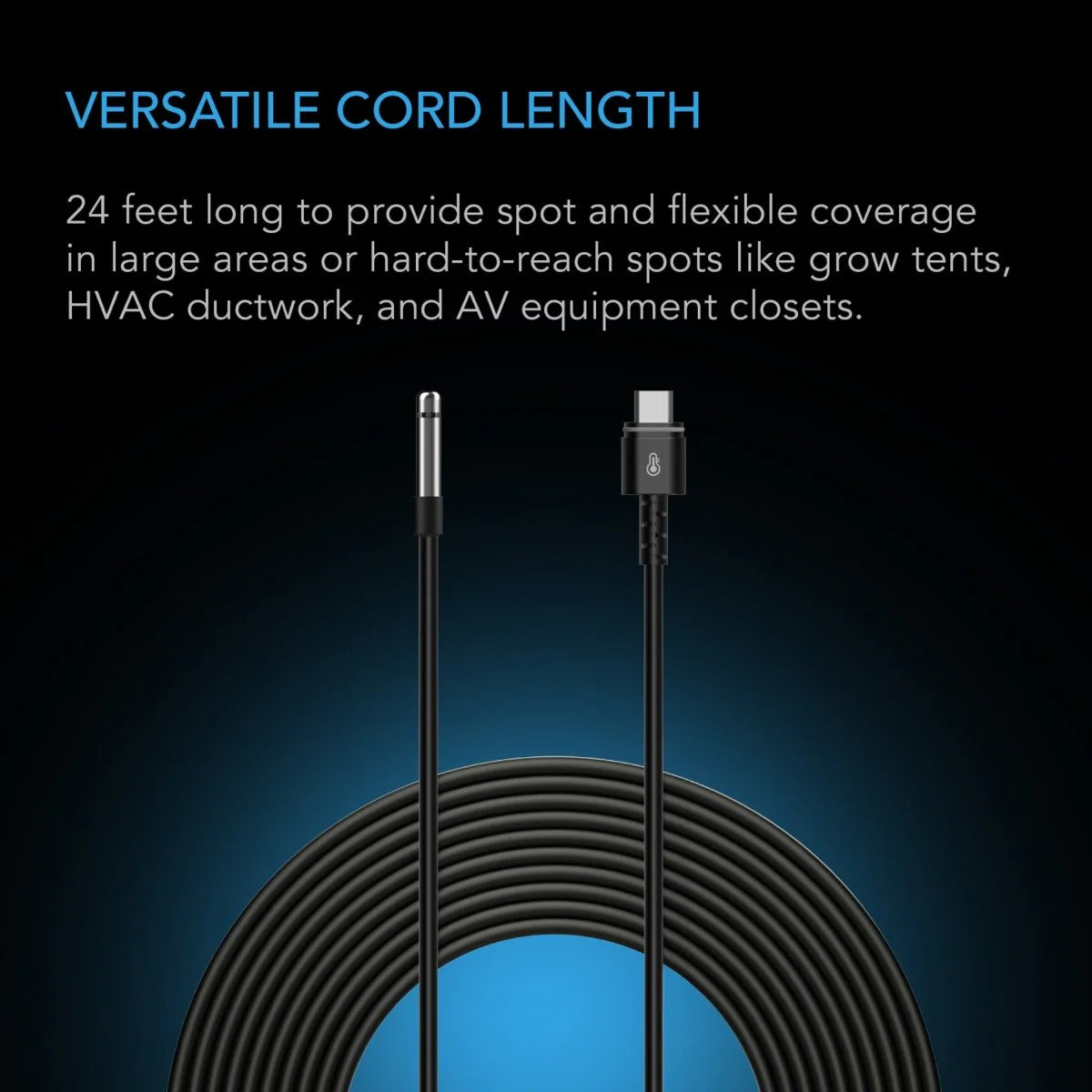 - 24 ft. length for spot detection coverage in grow tents, HVAC ductwork, tool sheds and AV closets.
