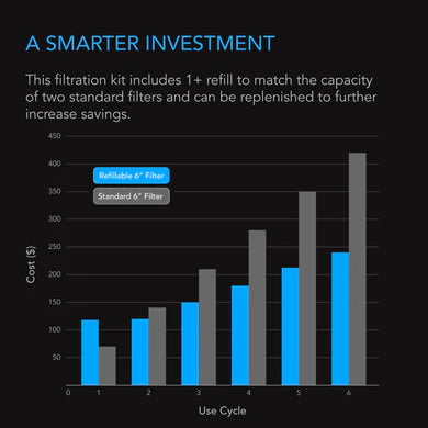- Includes 1+ refill to match the filtration capacity of two standard 6” carbon filters while costing less.