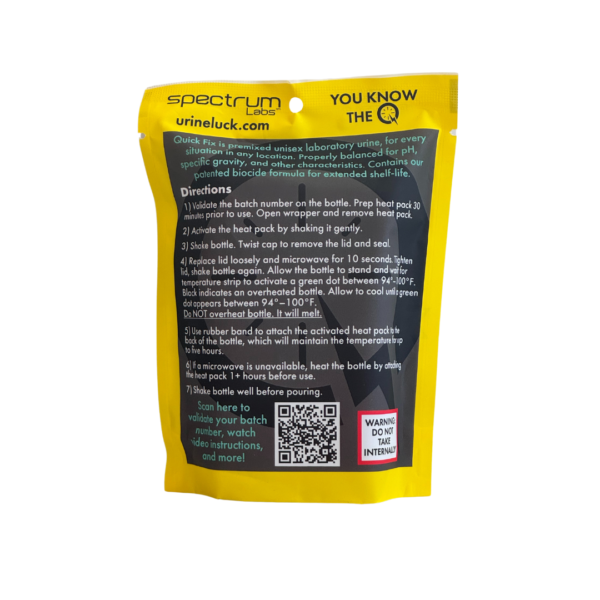 The Quick Fix bottle comes with an attached temperature strip and heating pad to ensure the sample is at body temperature. The Quick Fix Plus (large size) contains 90mL of synthetic urine.